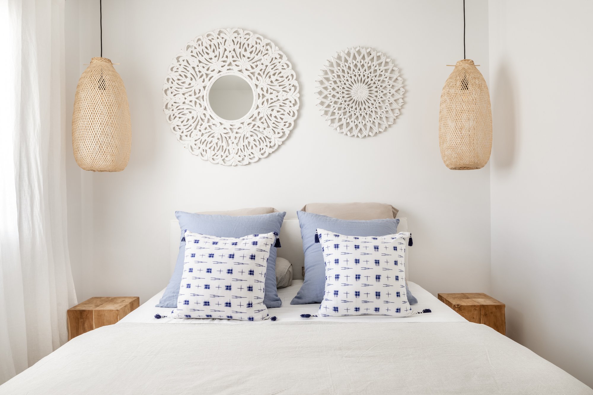 Cama con almohadas sobre cabecera blanca decorada con arte en la pared, lámparas de mimbre y mesa de madera a los lados en una habitación luminosa.