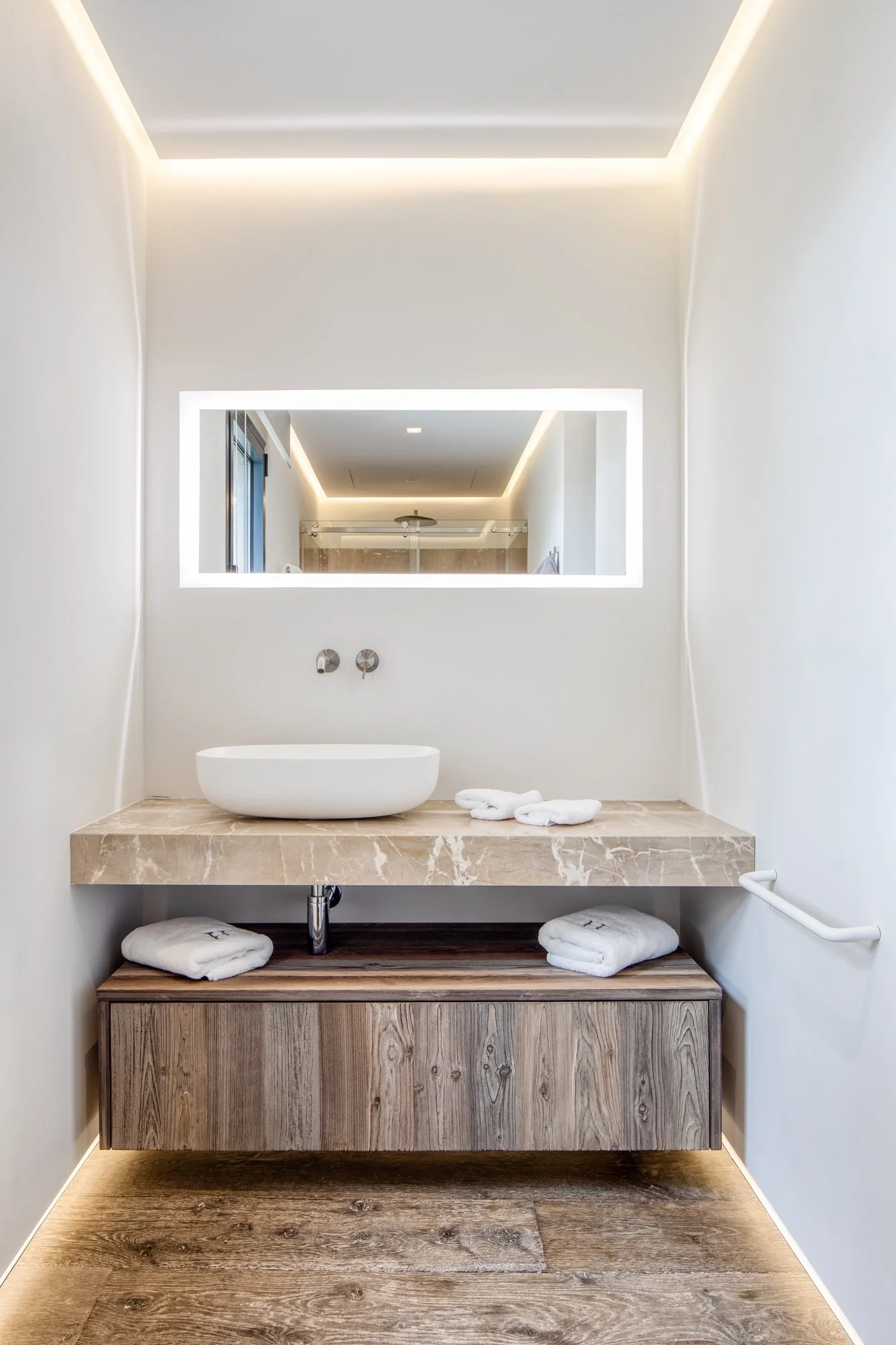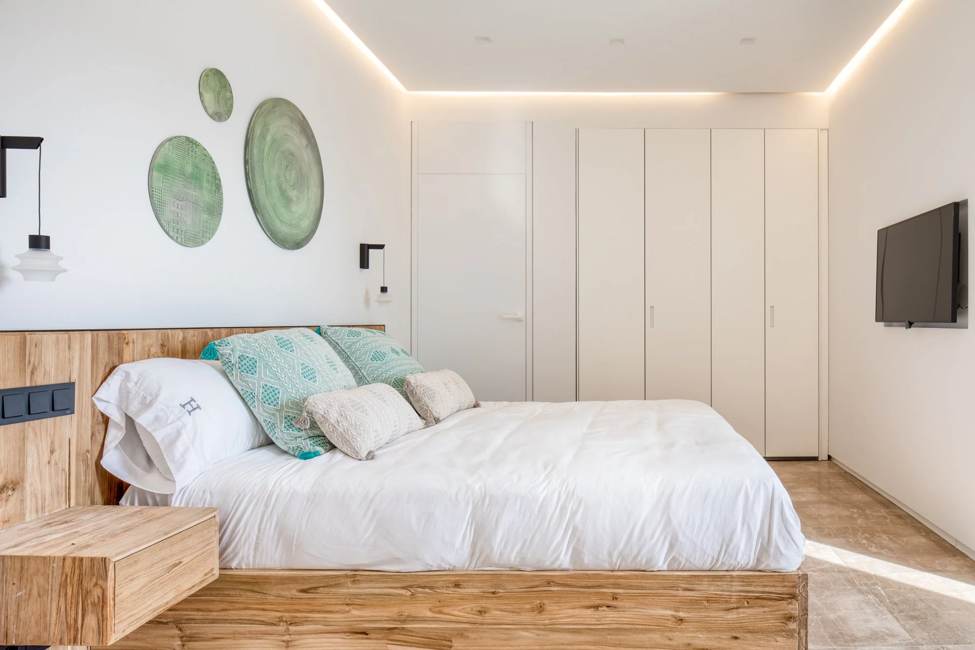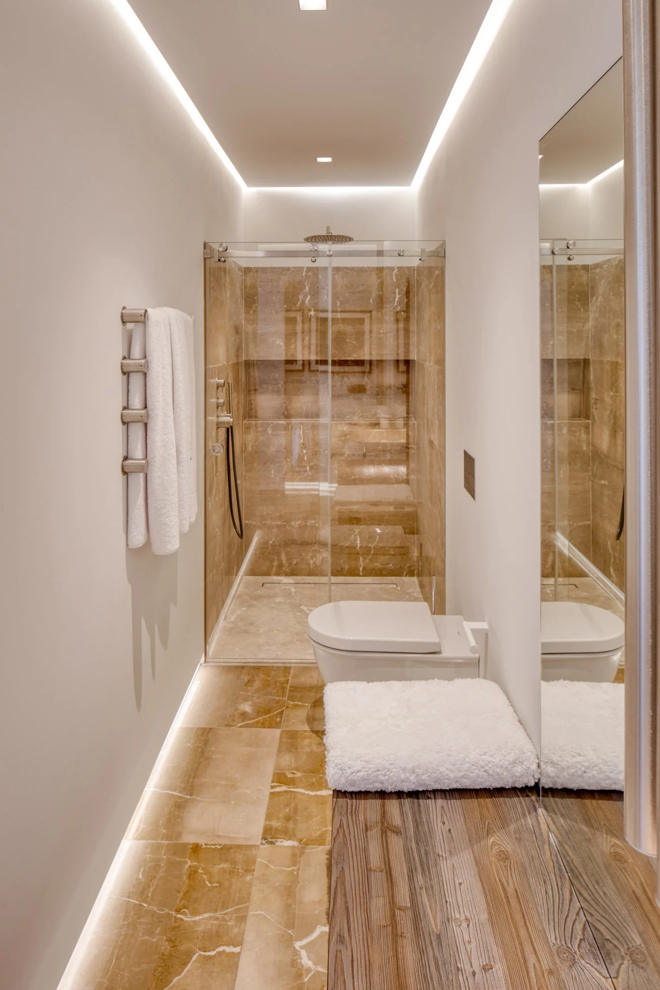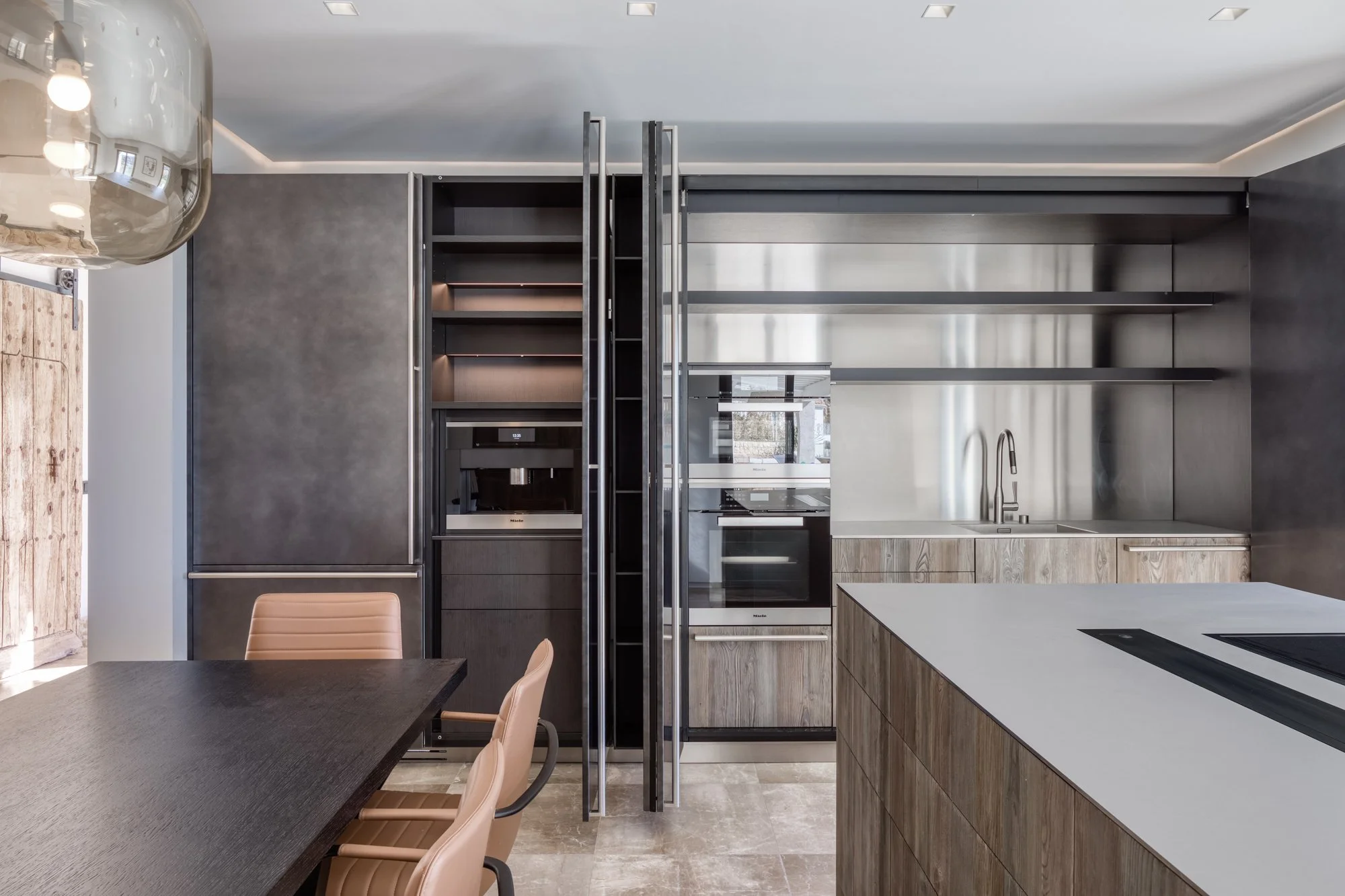 Una pieza muy importante es la cocina de la conocida marca Boffi que gracias a sus puertas escamoteables nos permite cerrarla y ocultarla cuando sea necesario. También queremos destacar el trabajo que se realizó en las puertas de paso al ser revestidas con el mismo parquet.