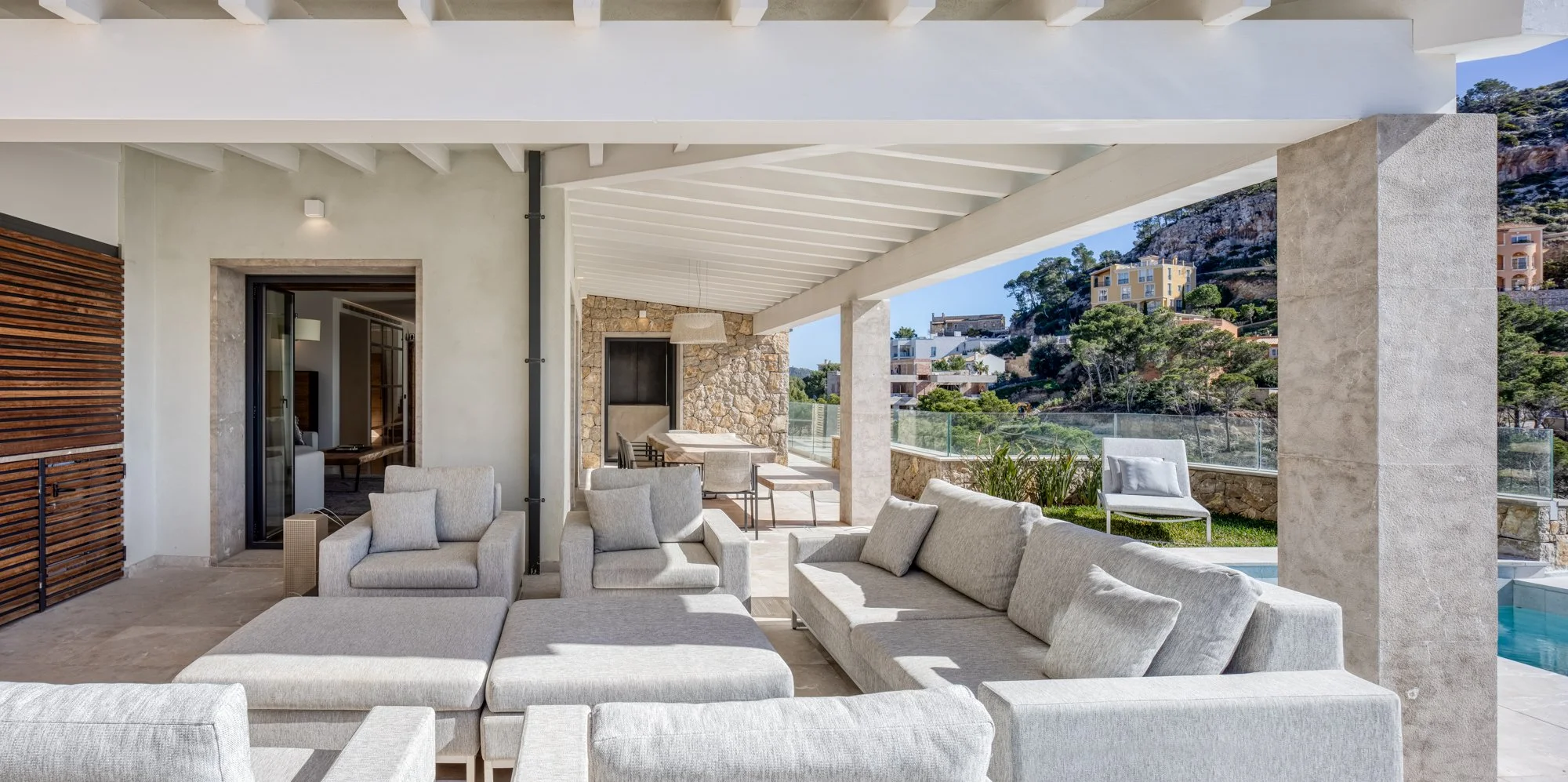 Proyecto de reforma y amueblamiento integral de una vivienda unifamiliar de lujo en las colinas del Puerto de Andratx. Se han potenciado las vistas en el trabajo de arquitectura y el uso de materiales locales como la piedra de Binisalem y los muros de piedra en seco.
